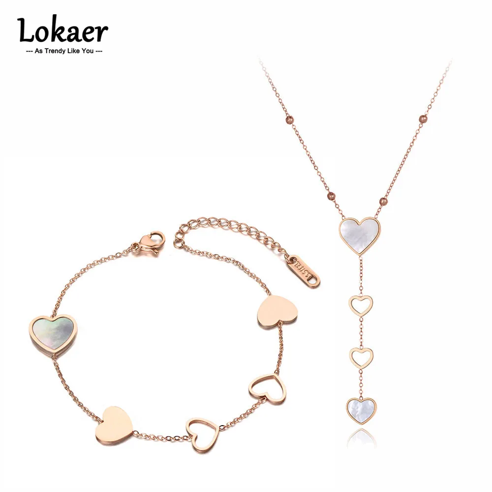 Lokaer Titanium Stainless Steel White Shell Love Heart Choker Necklaces Bracelets For Women Girls Trendy Jewelry Sets SE073
