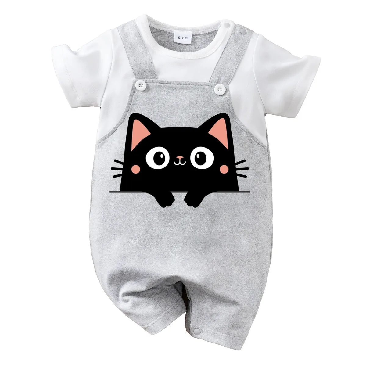 IURNXB Baby Romper Summer Infant Cartoon Cute Black Cat Printed Unisex Short Sleeve Onesie with Suspender Adorable Outfit 0-18M