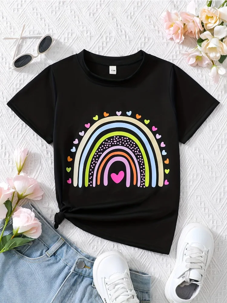 Summer Baby Girl Black Clothes Kid Girls Casual Heart Rainbow Printed T-shirts Children Fashion Crew Neck Short Sleeve Top  Read more