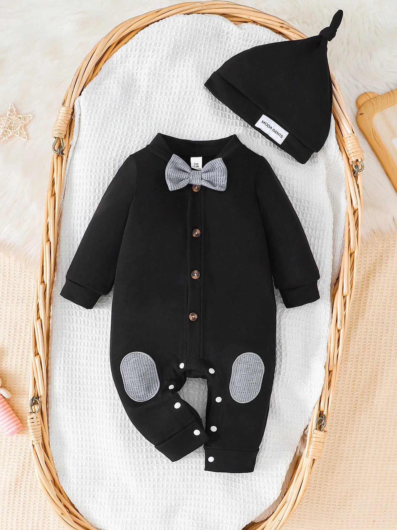 Baby Boys Autumn Solid Color Long Sleeve Onesie Breasted Cardigan Gentleman Bow Tie Bottom Crawl Suit Black Hat Two-Piece Set