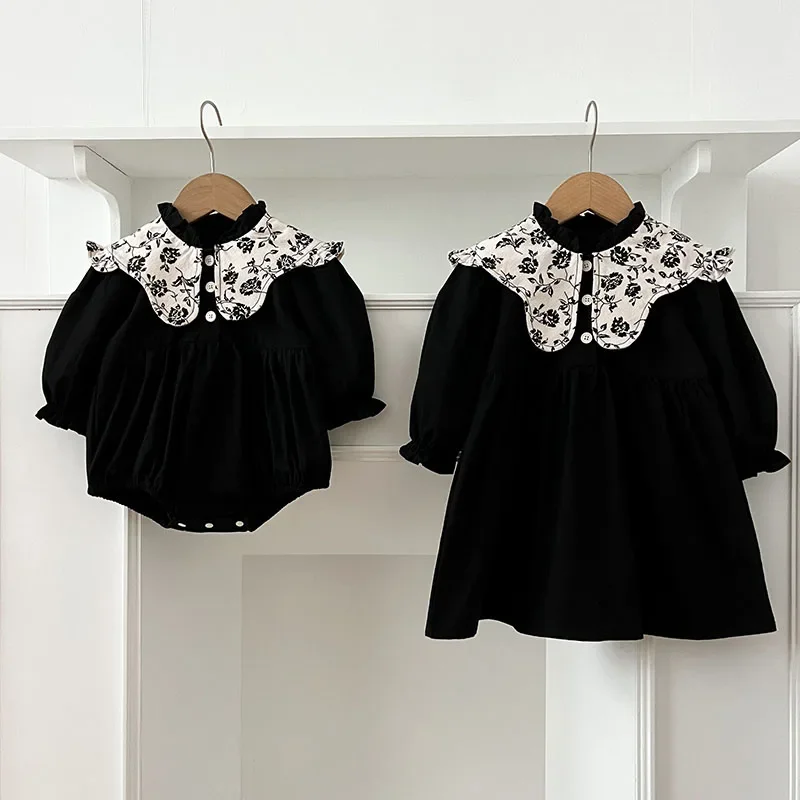 New Spring Sister Clothes Infant Baby Girls Party Dress Black Brown Vintage Flower Toddler Baby Bodysuits Kids Princess Dress