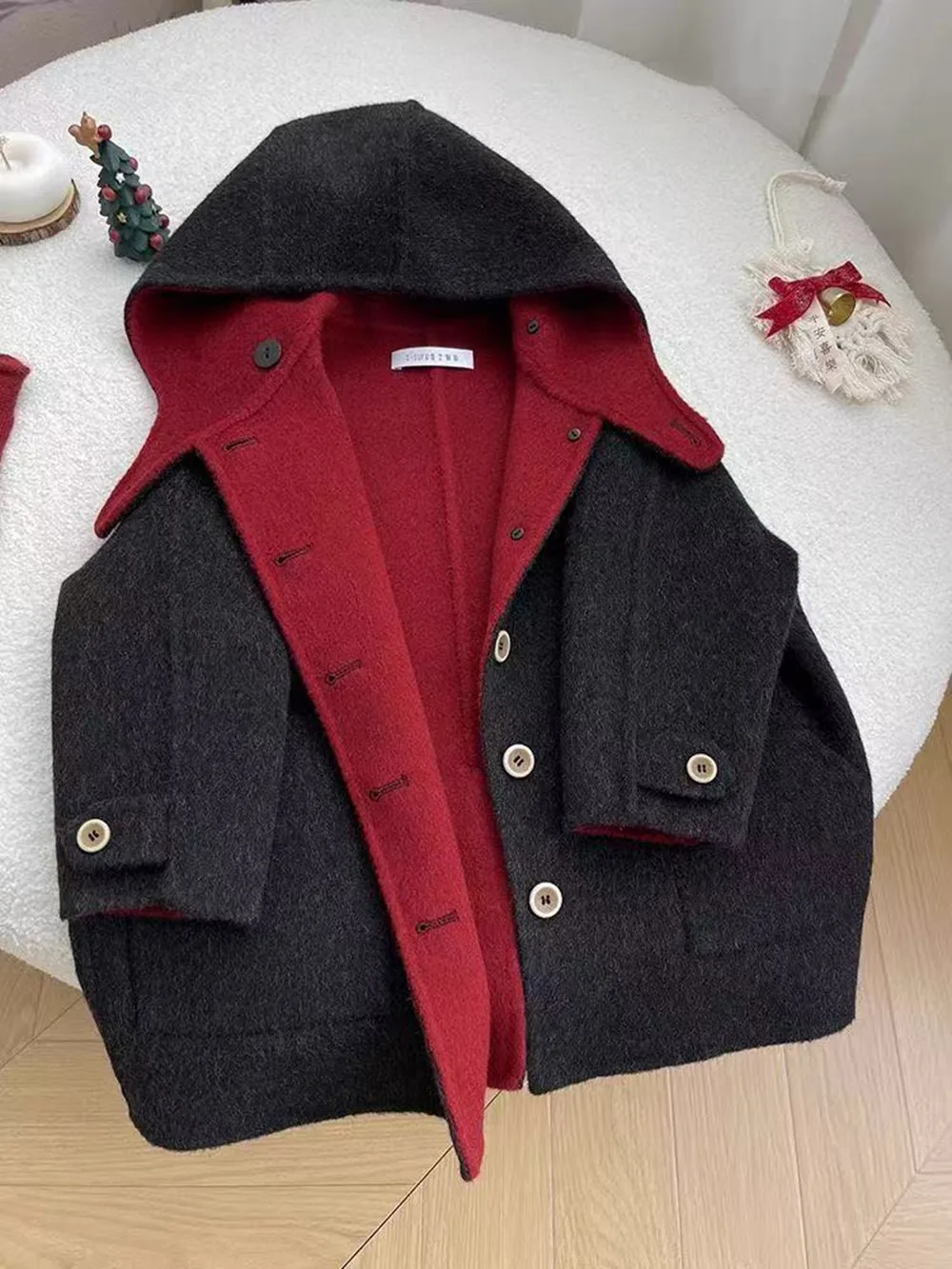 2025 New Autumn And Winter Girls' Woolen Coat New Children's Black Double sided Woolen Coat Children's Hooded Thickened Coat