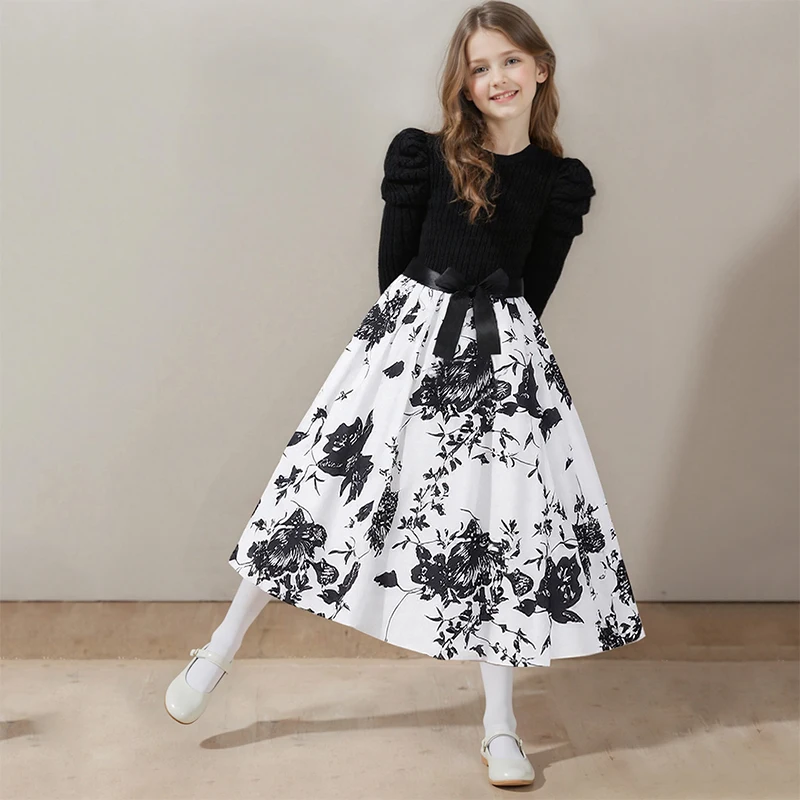 Fashion Trend Autumn Dress For Kids Girls Black Long-Sleeved Printed Dress Classic Design Exquisite Workmanship Princess Dress