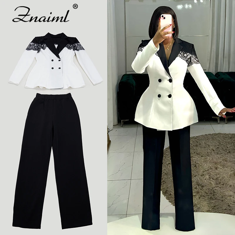 Znaiml Two Pieces Blazer Suits Women Autumn Black Lace Stitching Blazers Tops and Straight Pant Outfits Business Formal OL Style