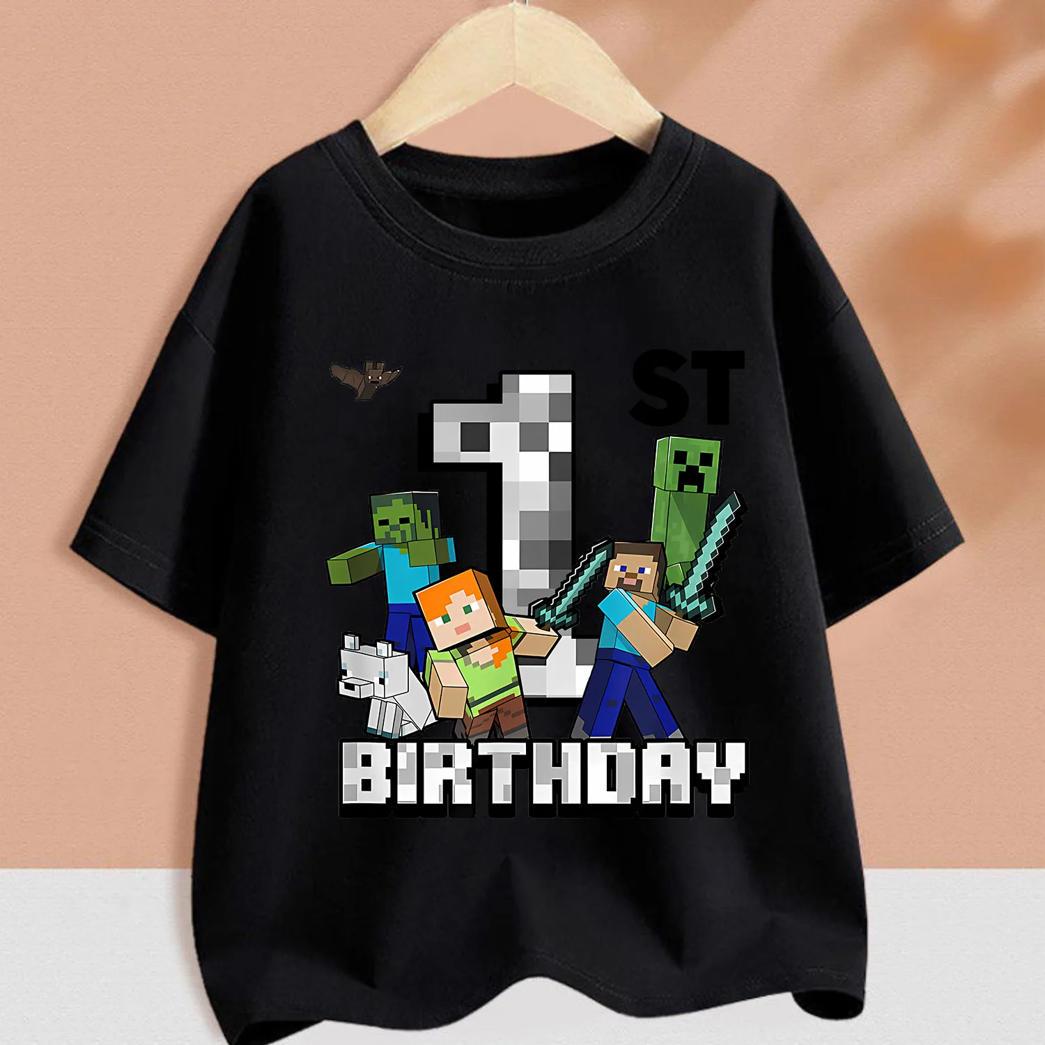 Pixel Game Black T-shirt Children Birthday Figure Clothes Cartoon Round Collar Clothing Kids Short Sleeve Summer Tee Top Gift
