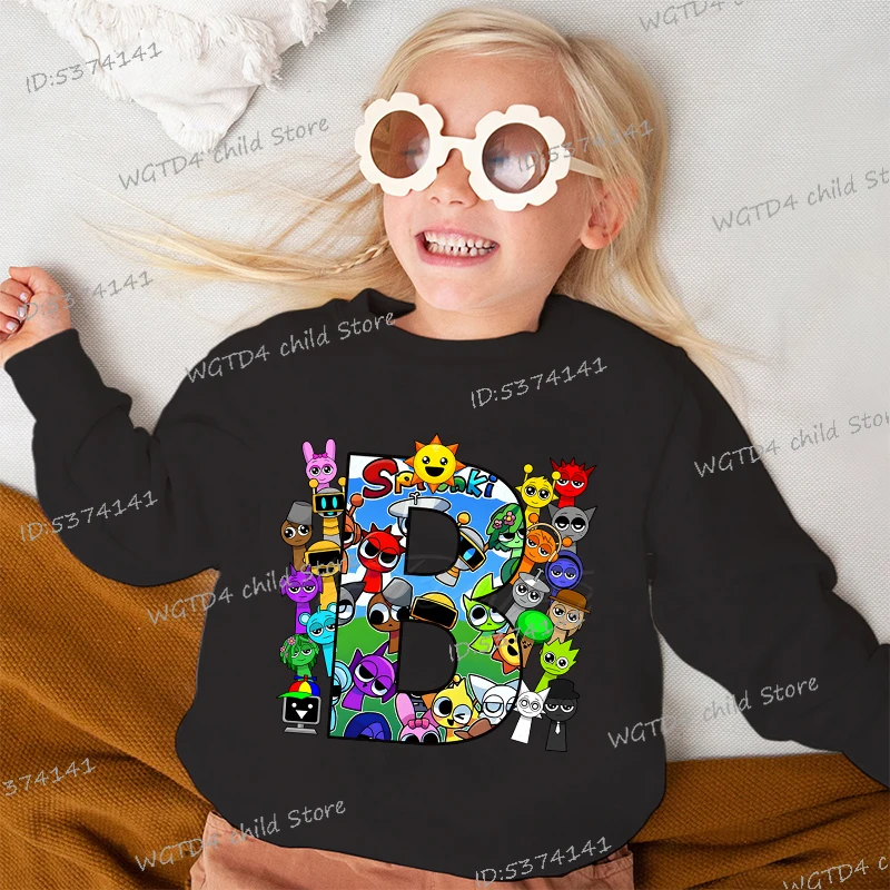 Black Sweatshirt Sprunki Kawaii Alphabet kids Clothing Fashion Boys Girls Long Sleeve Hoodless Pullover Cartoon Horror Game Tops