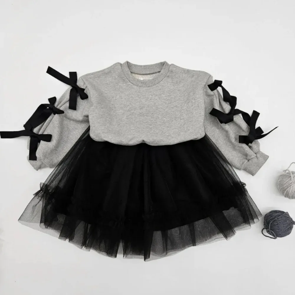 Fashion Street Style Girls Clothes Autumn Gray Long Sleeved Bow Top+Black Mesh Skirt Korean Version Children's Set