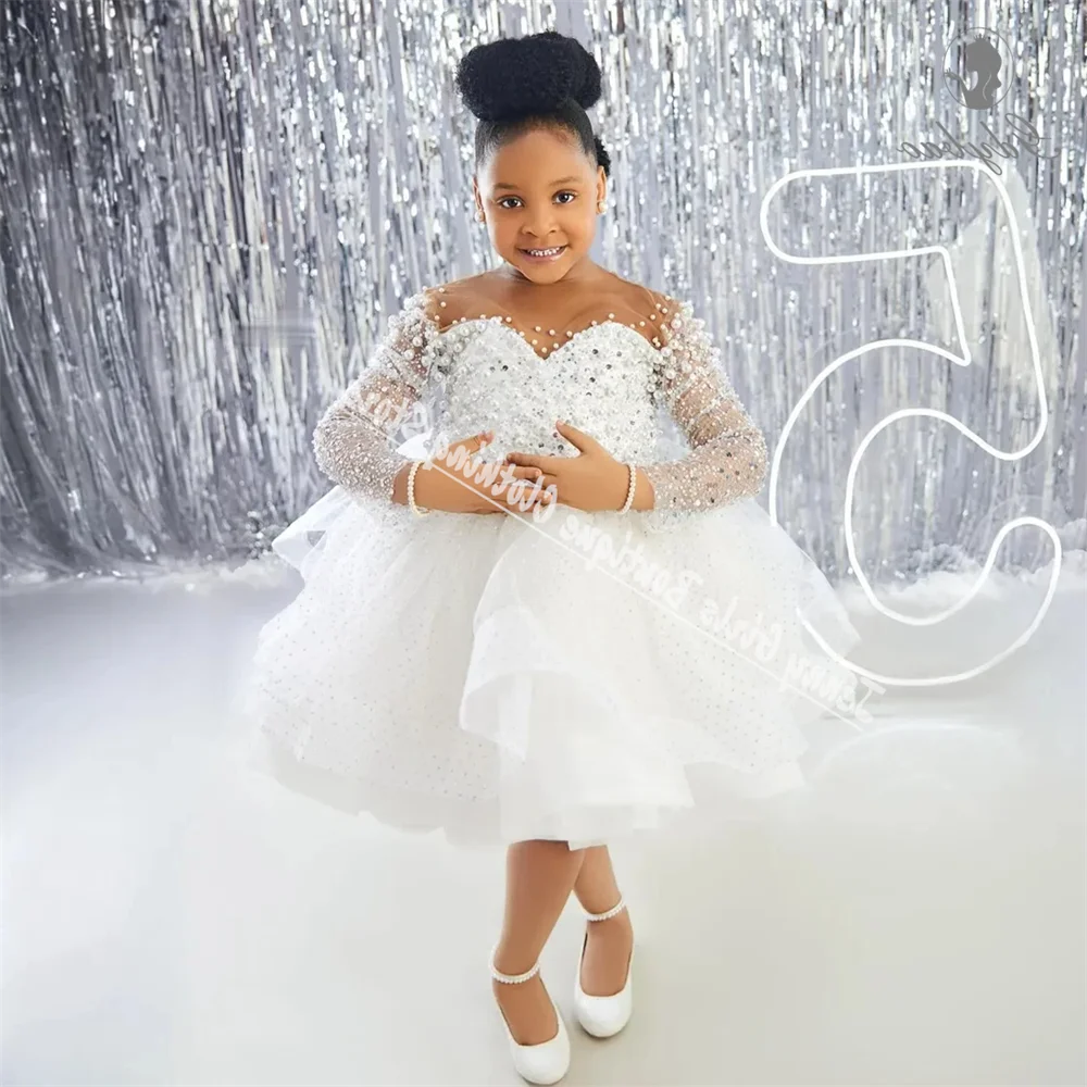 White Little Girls Pearl Flower Girl Dresses for Wedding Sheer Neck Sequined Lace First Communion Birthday Party Dresses