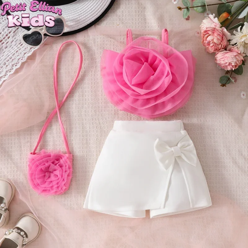2025 Summer New Style 0 - 4 Y Baby Girl Cute Floral Top & White Shorts Set with Bowknot and Matching Bag for Kids Girls Set