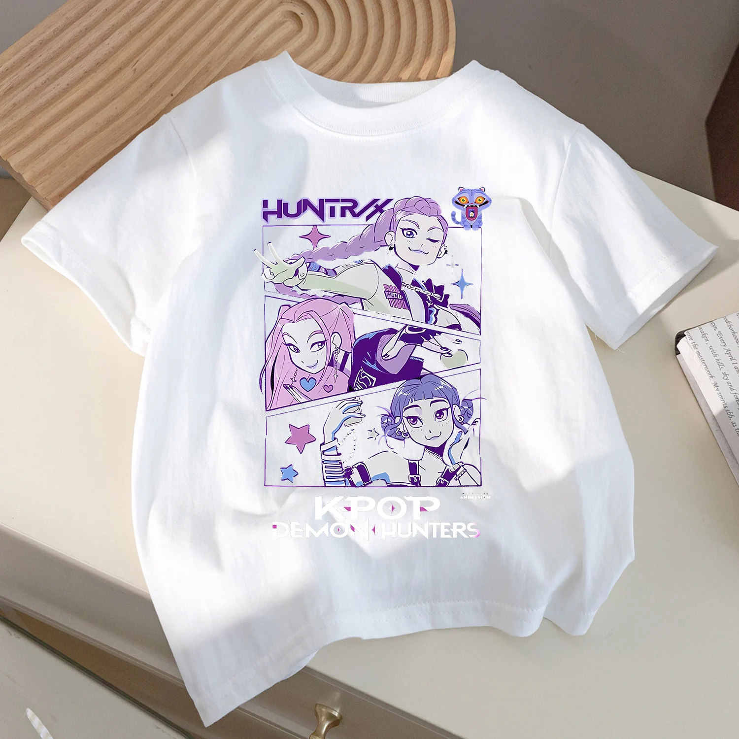 KPop Demon Hunters T-shirt for Children Cartoon White Tee Top Anime Round Collar Short Sleeve Clothes Kids Summer Clothing Gift