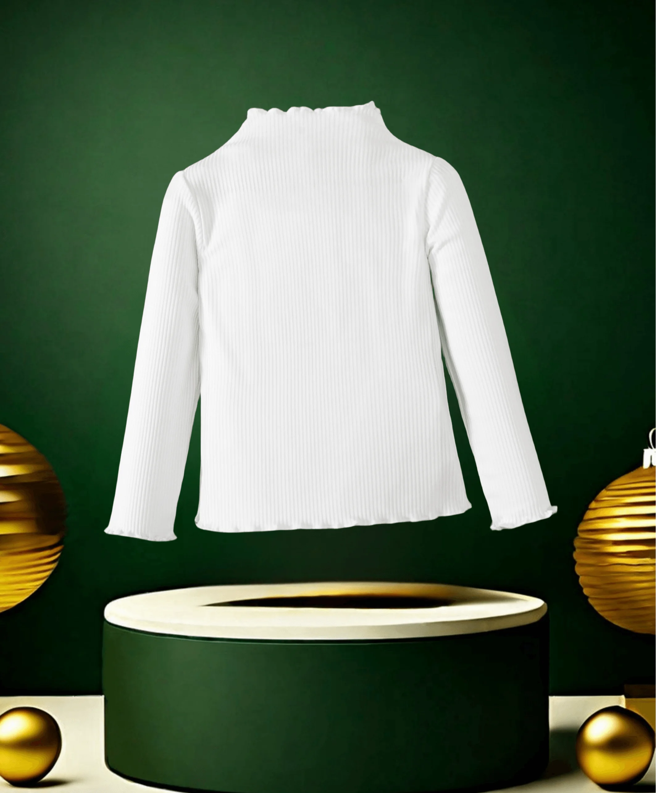 Girls white mid-neck long-sleeved T-shirt - elegant and dense collar, comfortable ribbed fabric, simple and versatile