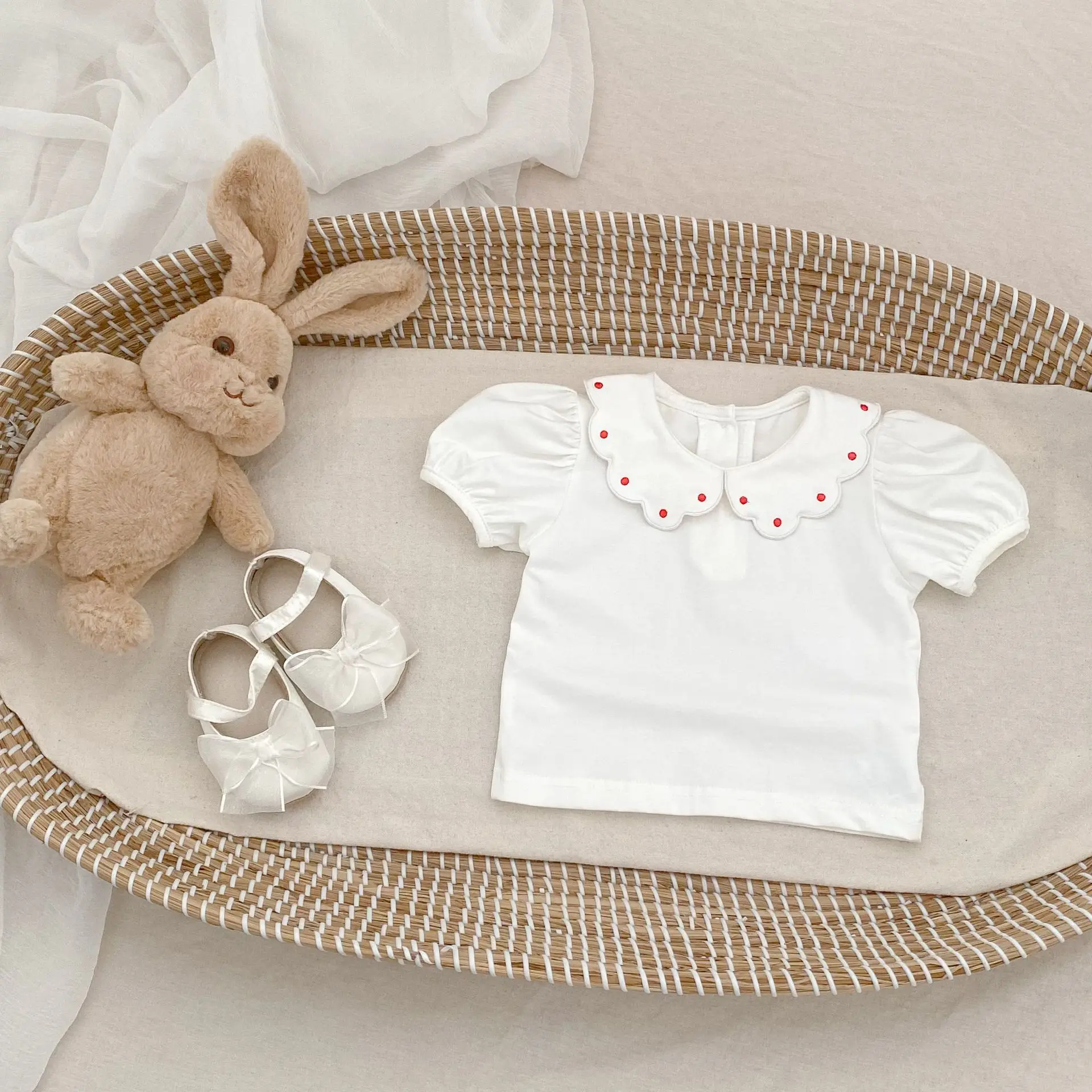 Summer new 0-3 year old baby clothing, short sleeved top for baby girls, cute doll collar simple white T-shirt