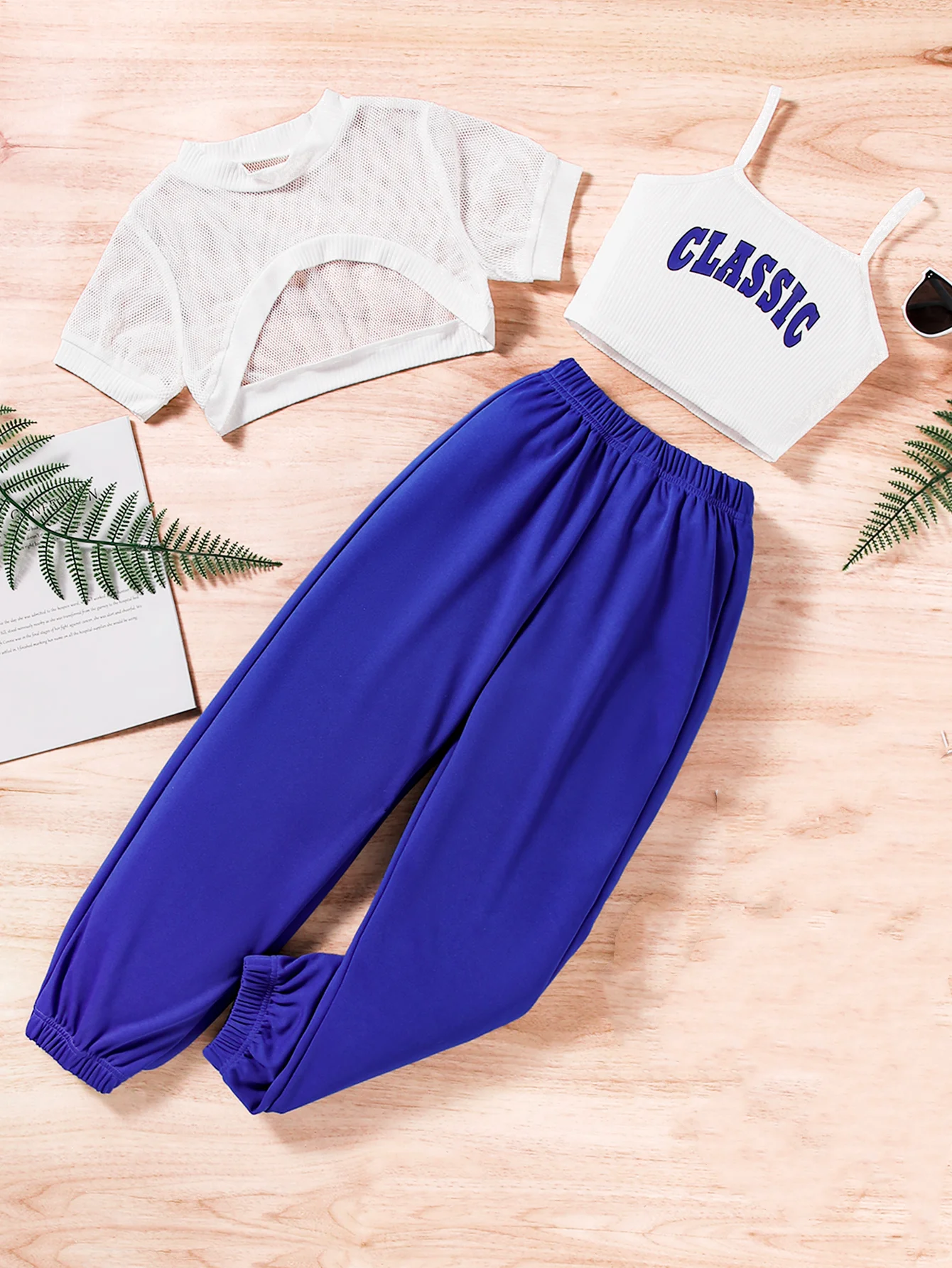 Girls summer white cartoon letter printed halter vest folded with hollow-out short-sleeved coat solid color pants two-piece set