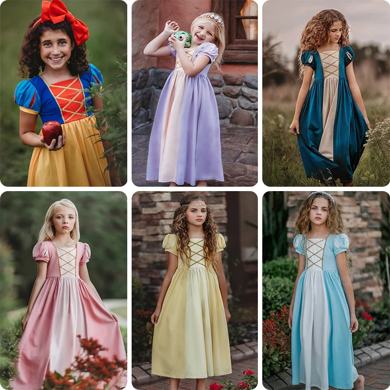 Summer Knitted Rapunzel Princess Party Dress for Girls Kids Halloween Cosplay Belle Cinderella Aurora Melinda Snow White Costume