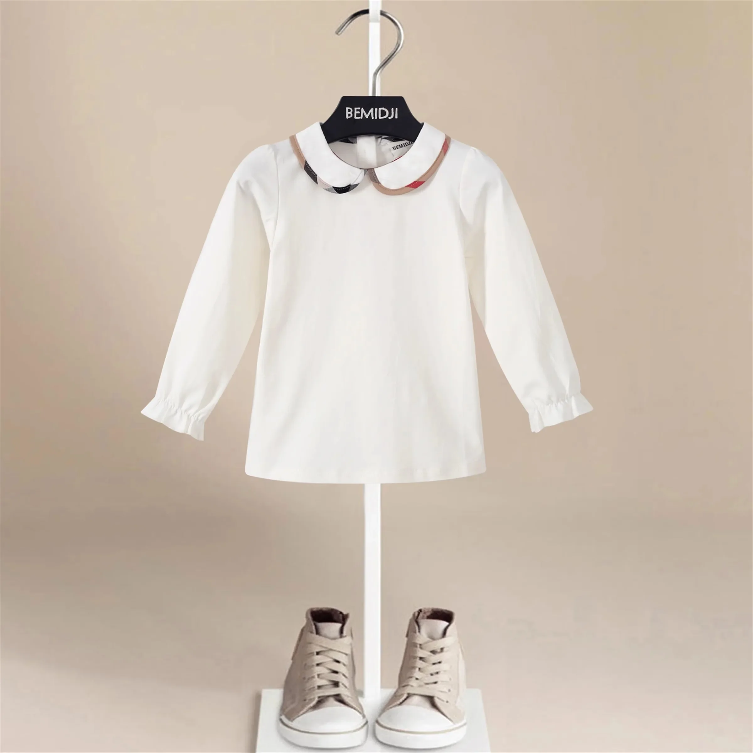 White Plaid Doll Collar Shirt Baby Girls Round Collar Long Sleeve Pullovers Spring Fall Toddler Girls Bottom Shirt Children
