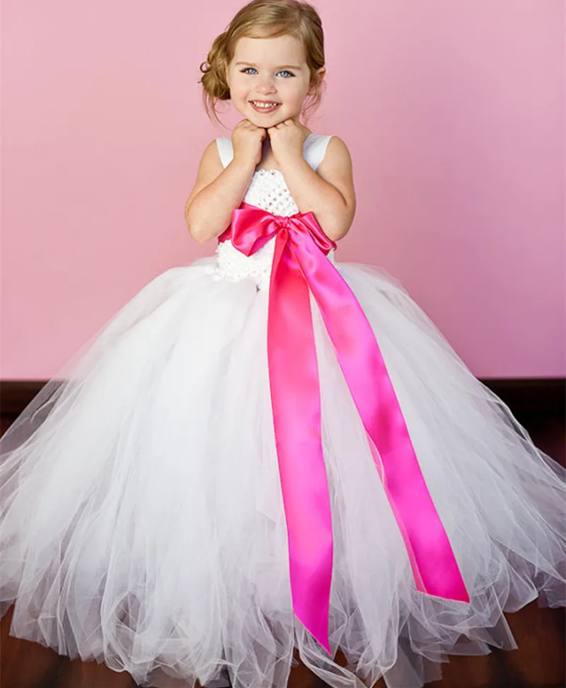 Cute Girls White Flower Girls Dress Kids Crochet Tulle Tutus Ball Gown with Pink Ribbon Bow Children Wedding Party Long Dress