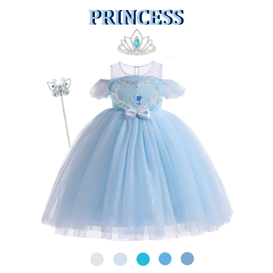 Girl Elsa Blue Princess Dress Girls Short Sleeve Puff Dress with Cape Elsa Snowflake Dress Princess Birthday Party Dress Up