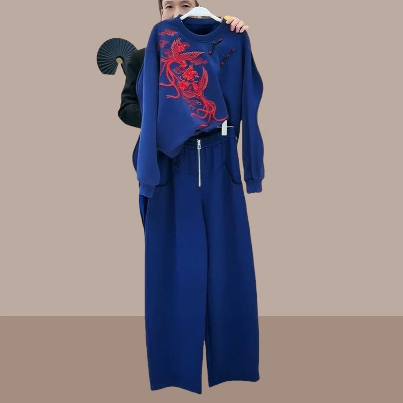 Sports and leisure women's autumn winter new Chinese style high-end blue and velvet sweatshirt and pants two-piece set