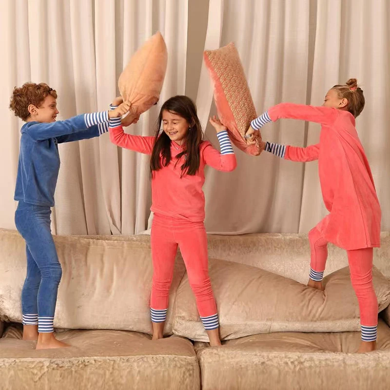 Children's pajamas family matching blue and pink set girls dress baby boy and girls romper autumn winter clothes stripes trims