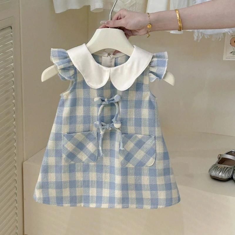Girls' French Dress Summer Elegance Children's Blue Checkered Tank Top Girls' Sweet Princess Dress