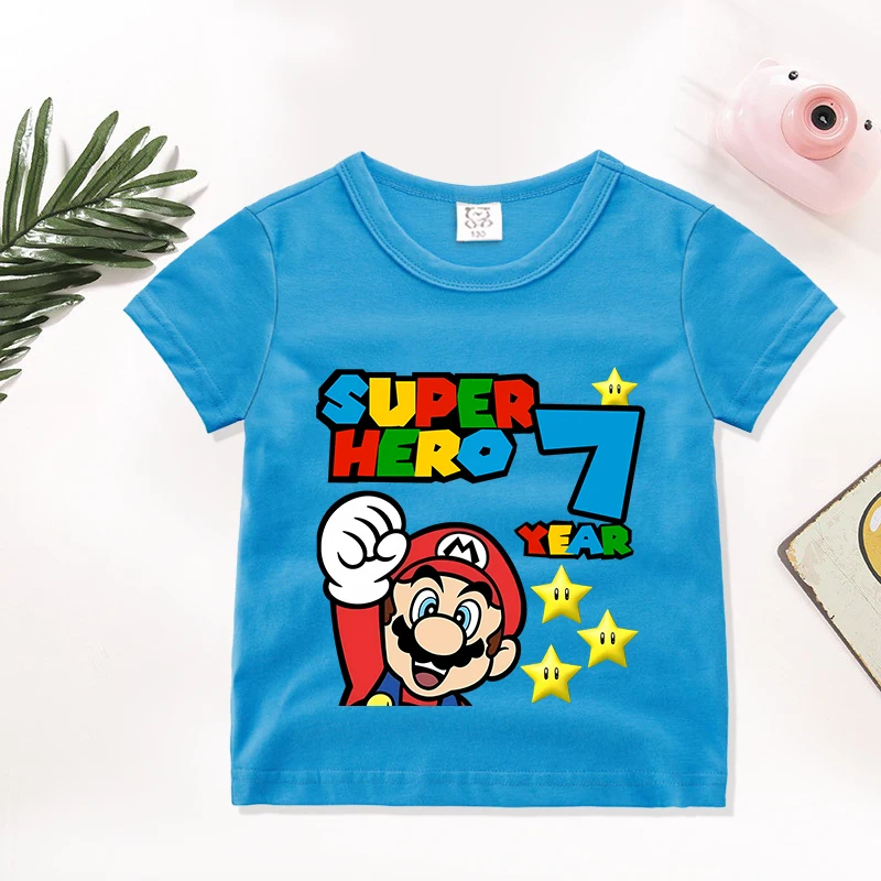 Super Marios Kids Number T-Shirt Boy Birthday Clothes Blue Short Sleeve Toddler Cotton Tee Summer Anime Cartoon Children Tops