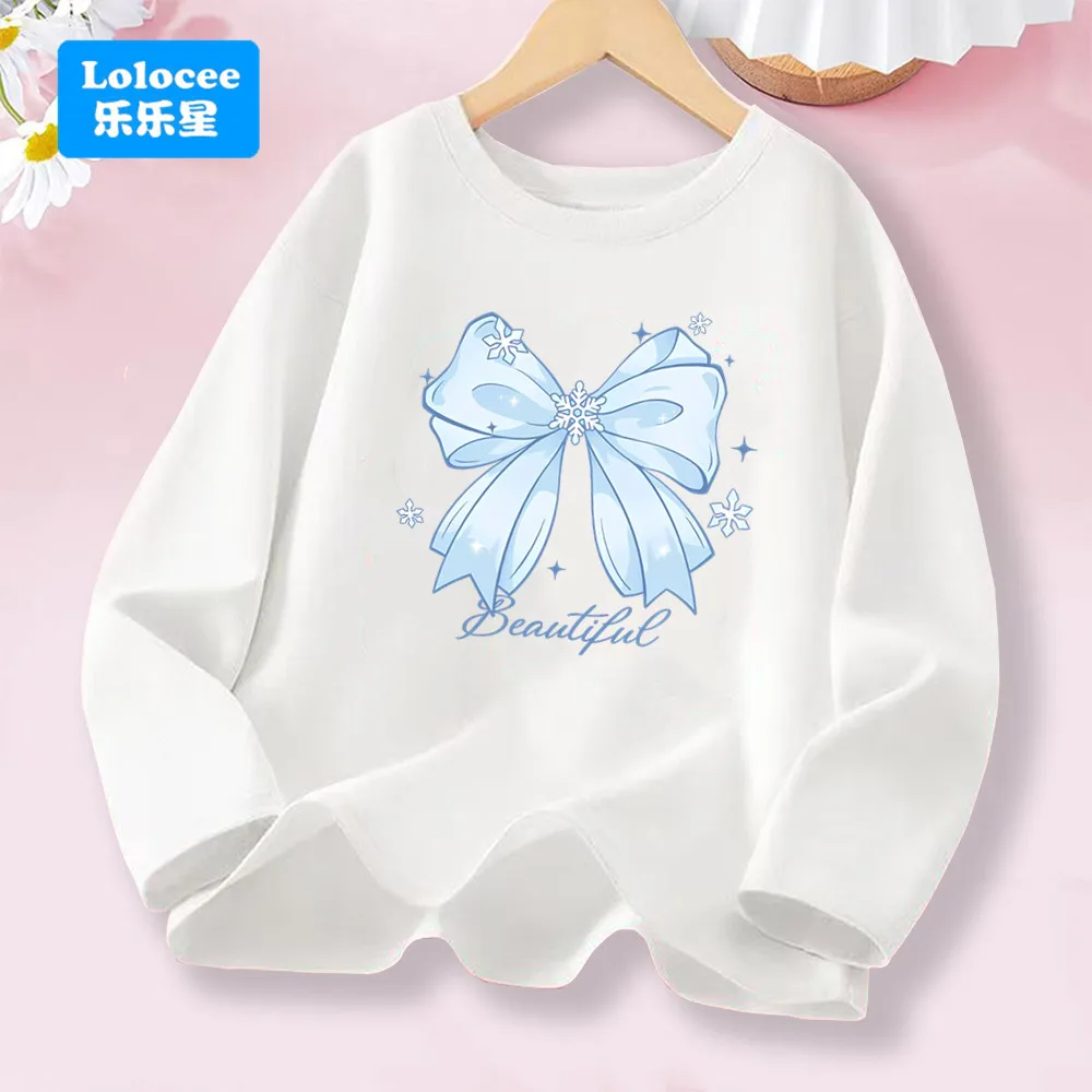Girls' Spring Long Sleeve T-shirt - Blue Bow & Snowflake "Beautiful" Print Kids Soft Cotton Top 2026 New Design