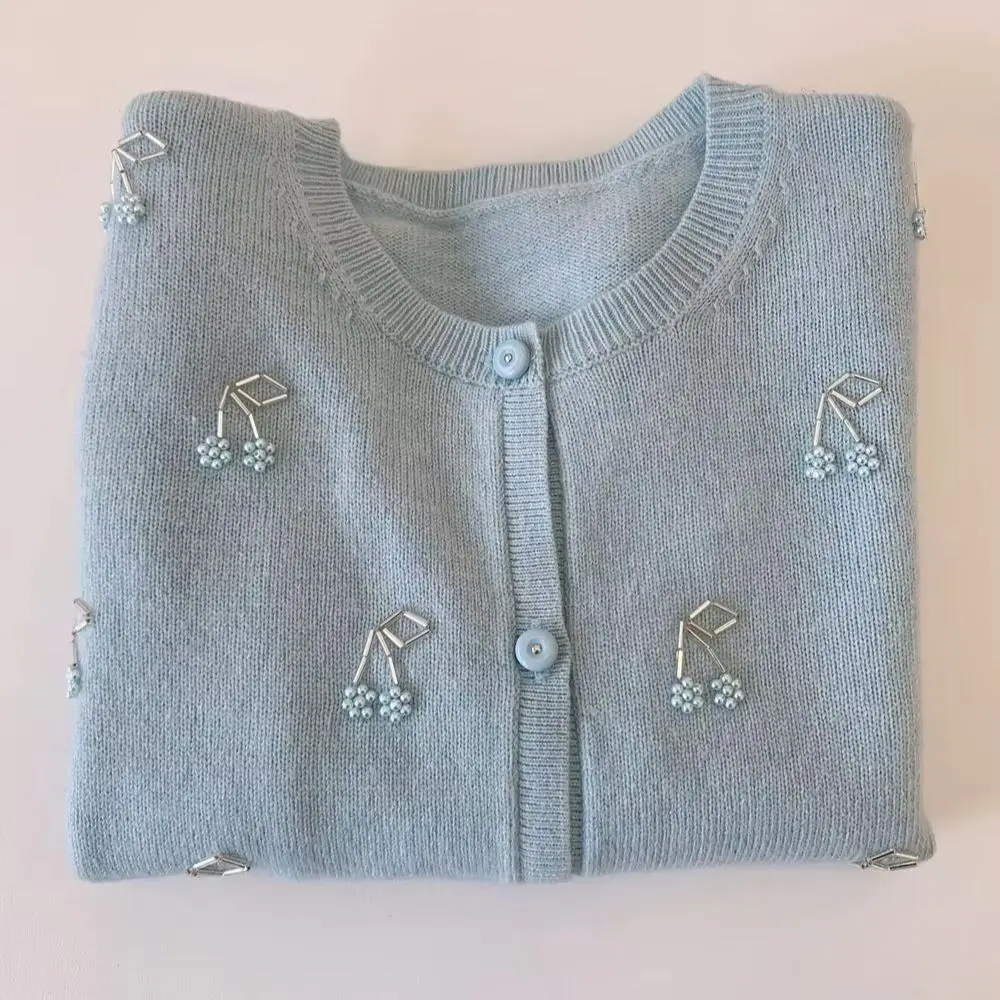 kids coat girl clothes Cartoon cherry bead pattern fashionable cardigan Girls' spring and summer blue knitted cardigan