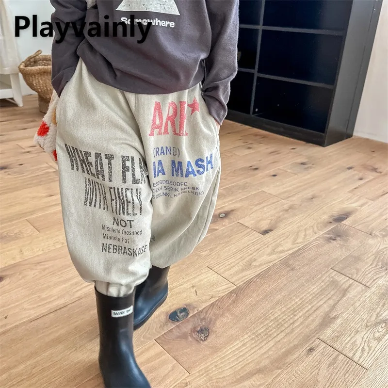 2025 New Spring Autumn Kids Harem Pants Washed Cotton Korean Style Beige Grey Yellow Letter Print Wide Leg Casual Trousers A3562