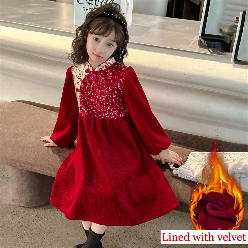 Girls' Winter Red Princess Dress Chinese New Year 2025 Dresses Child Chinese Style Traditional Clothes For Girl 2-15 Years Old