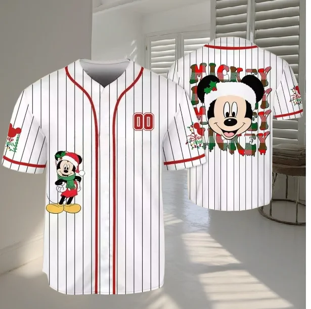 Disney Mickey Christmas Baseball Jersey T-shirt Personalized Quick Drying Sweat Absorbing Red/White Striped Trendy Sportswear