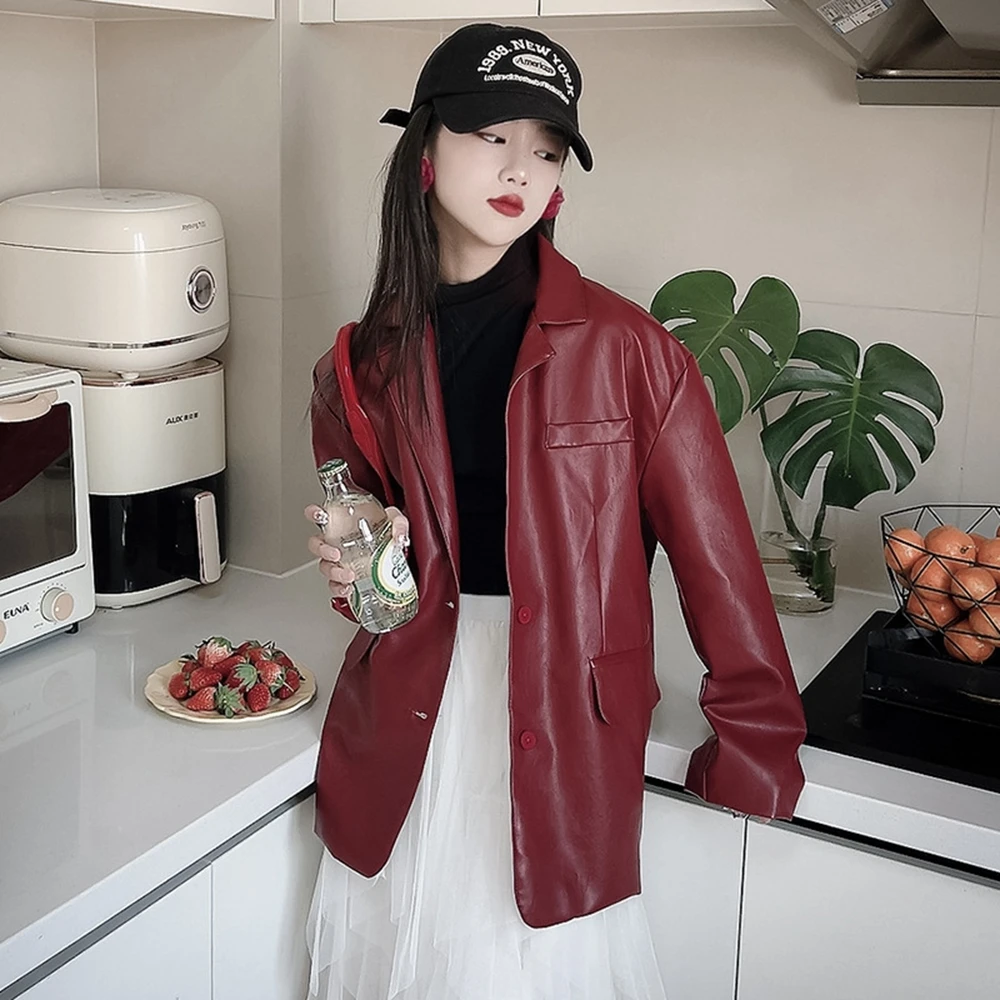 Girls Leather Blazer Spring Fall New Fashion PU Jacket Outerwear Loose Casual Teenage Kids Tops Clothes 13 14 15 Years Dark Red