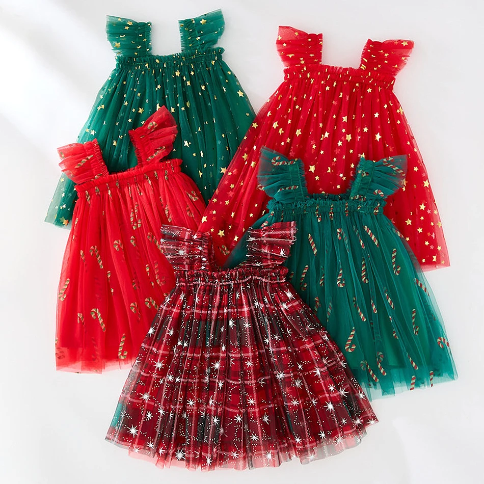 Infant Star Sequin Sling Dress Red Green Baby Girls Christmas Mesh Fluffy Princess Frocks Toddler Event Festival Party Clothing