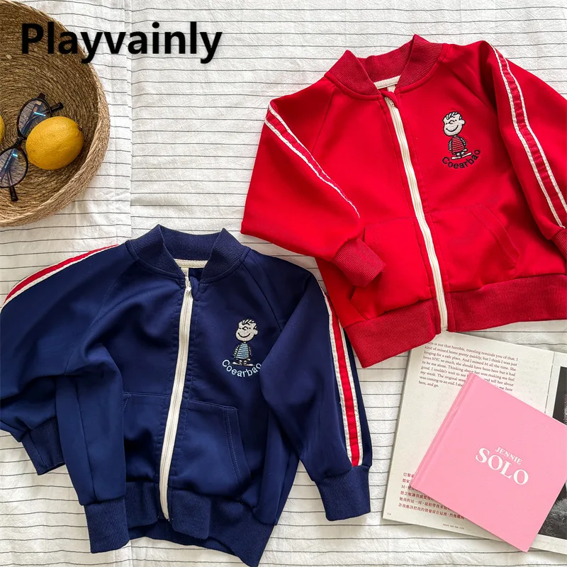 2025 New Kids Jacket Boys Girls Korean Style Spring Autumn Baseball Coat Red Navy Blue Cartoon Pattern Children Outerwear A6057