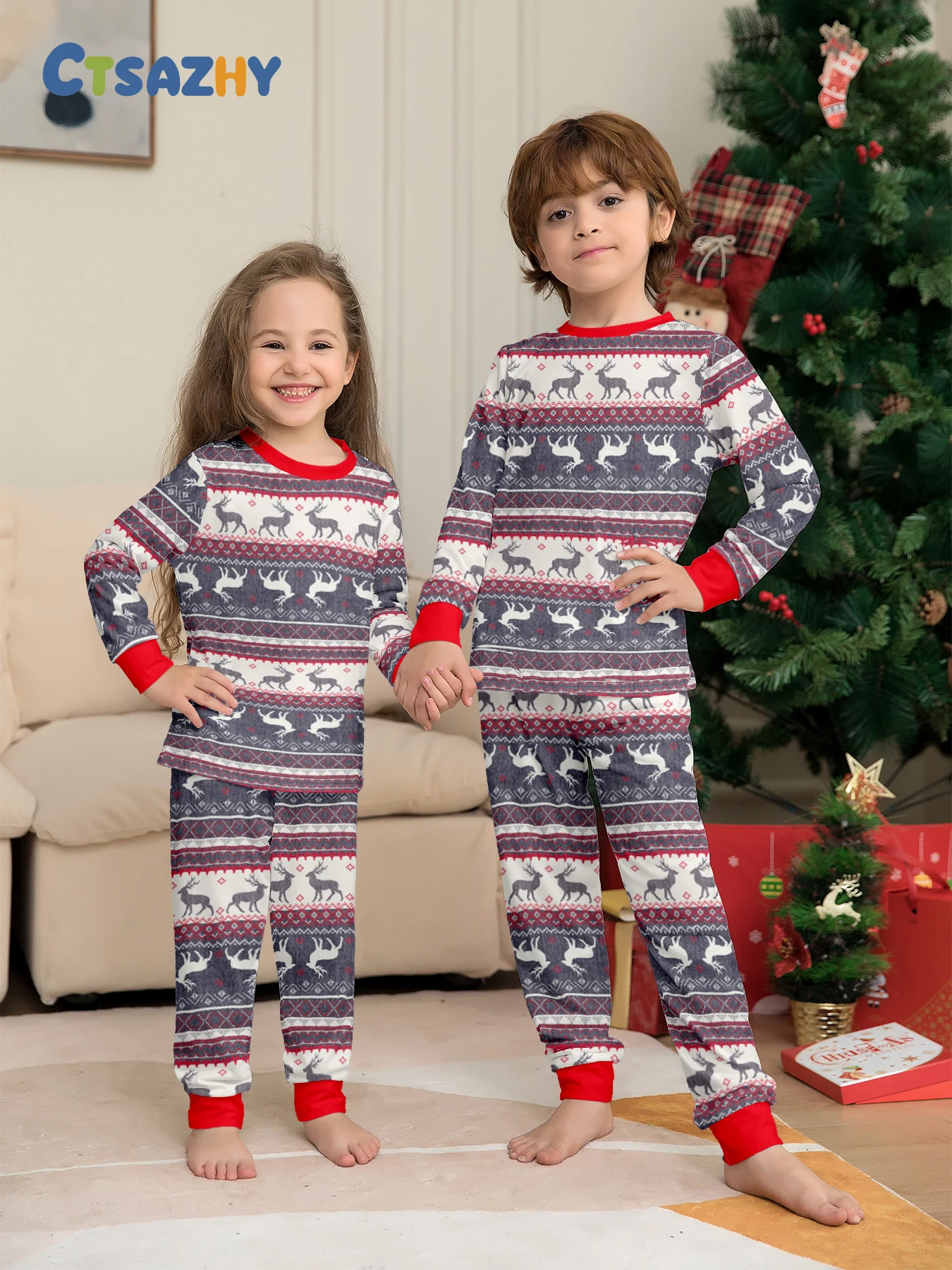 Christmas Children Sleepwear Set Reindeer Fair Isle Pattern Red Grey Long Sleeve Pajamas for Kids