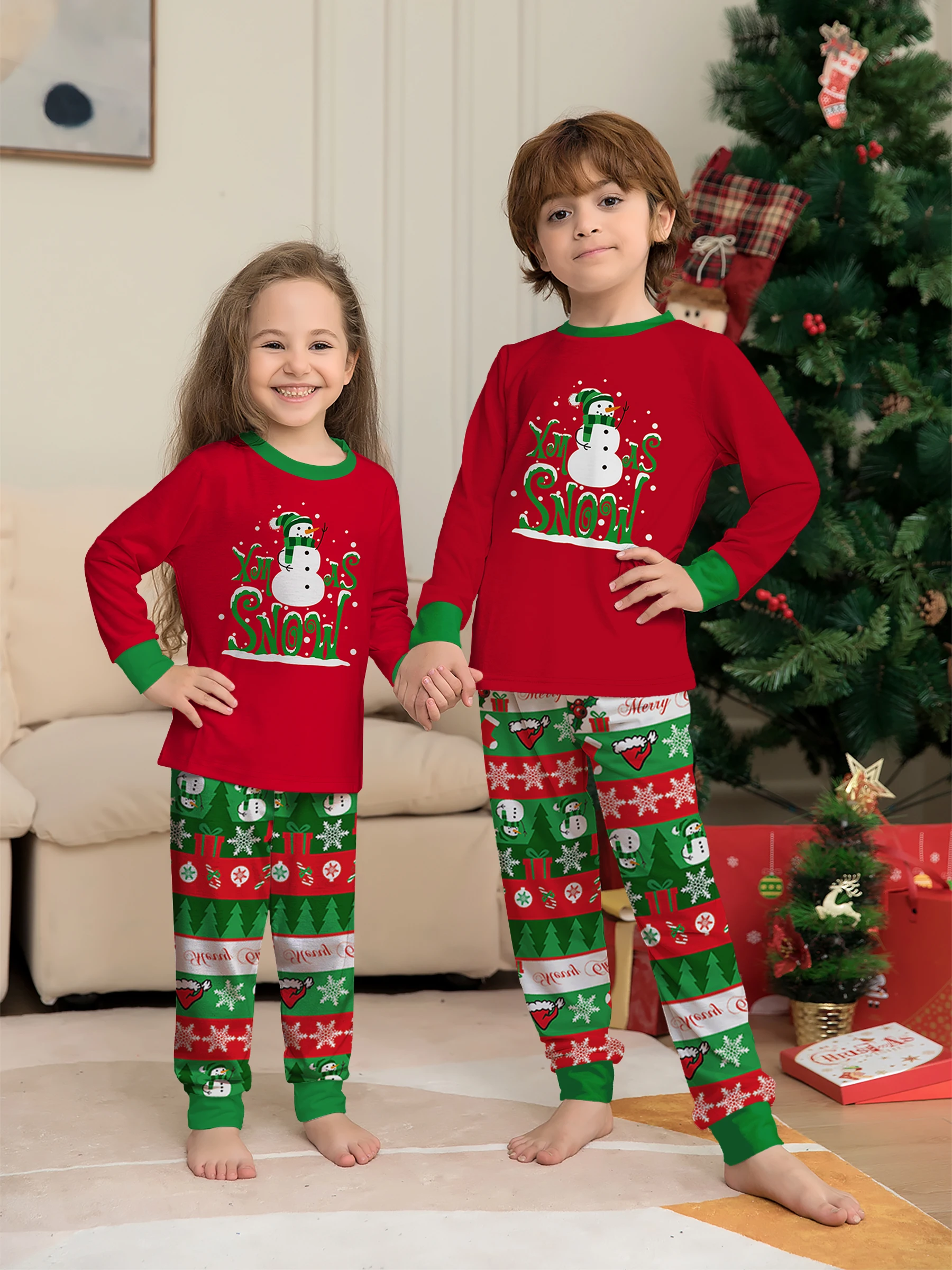 Christmas Kids Pajamas Set "Xmas Snow" Snowman Print Red Green Long Sleeve Sleepwear for Boys Girls