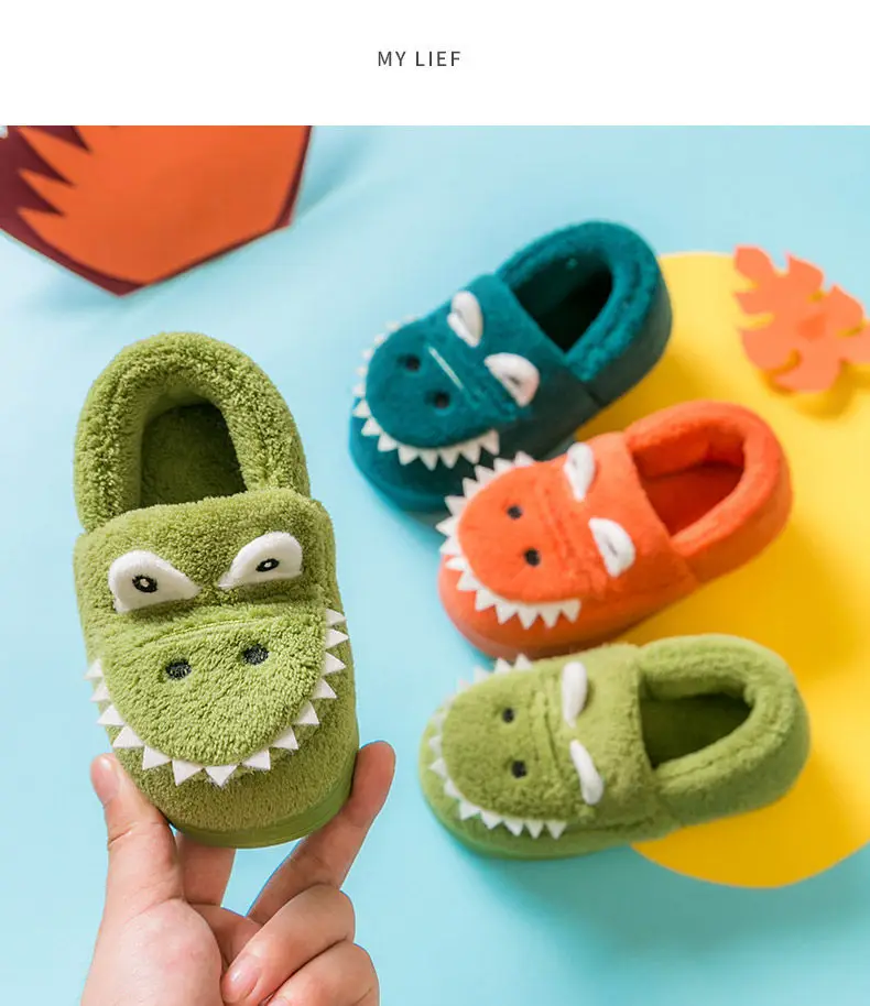 Cute green plush slippers with dinosaur cartoon pattern, suitable for toddler boys and girls, indoor wear