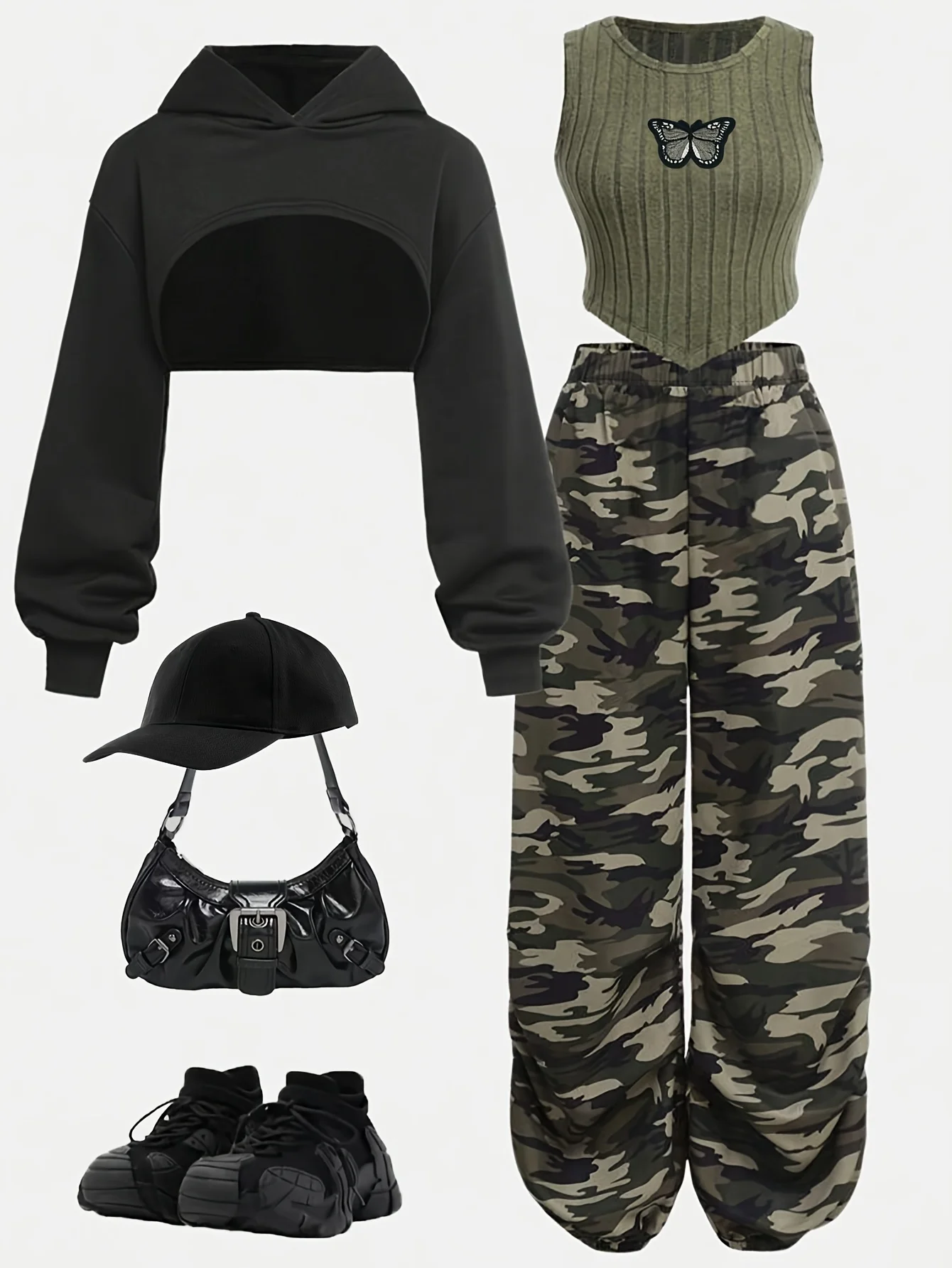 Children's Clothing Girls' Short Hooded Sweatshirt & Fleece Ribbed Vest & Camouflage Sweatpants Three-Piece Set for Girls, Army Green Cool Girl Outfit  Read more