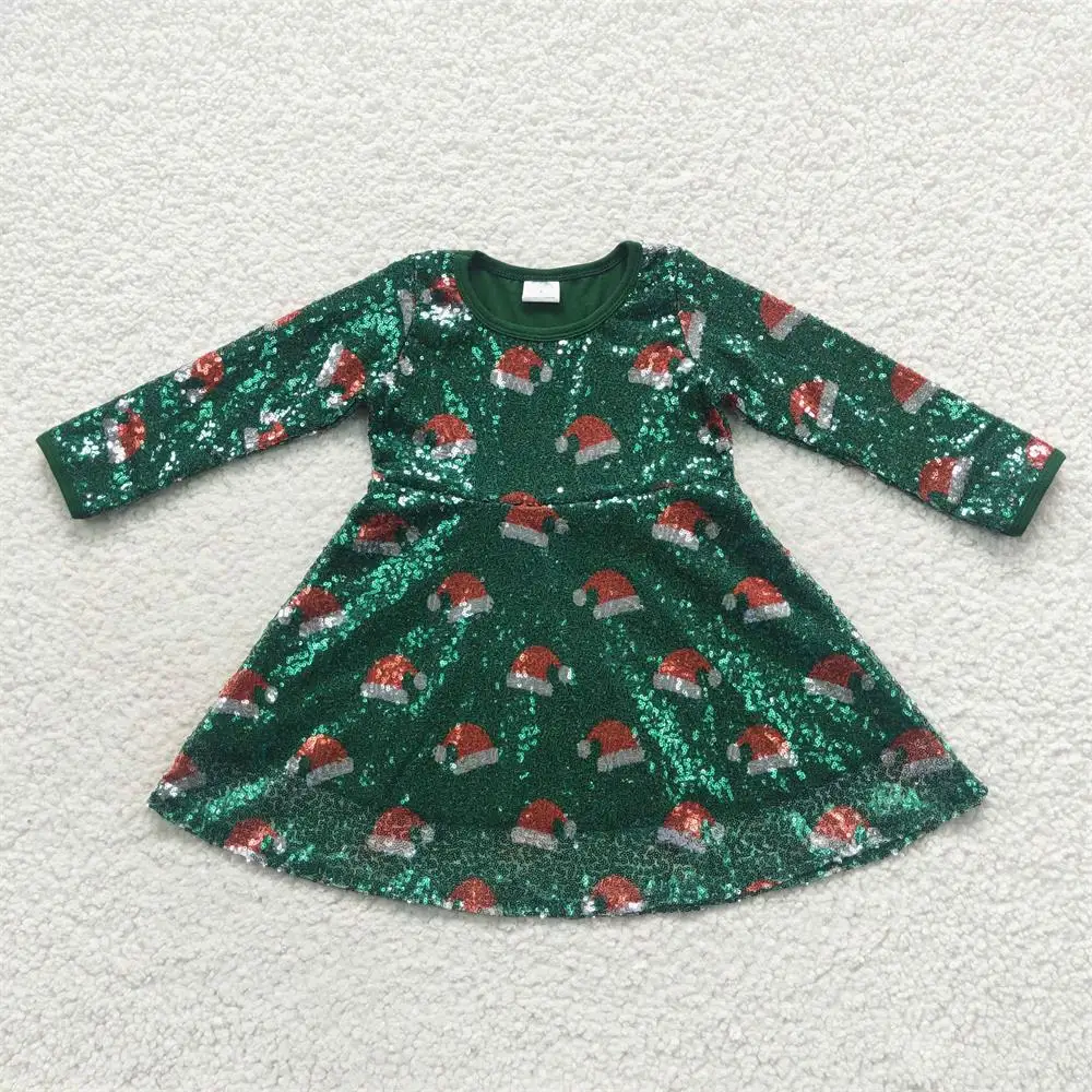 Wholesale Infant Toddler Long Sleeves Christmas Hats Sequins Dress Kids Green One Piece Children Baby Girl Clothing