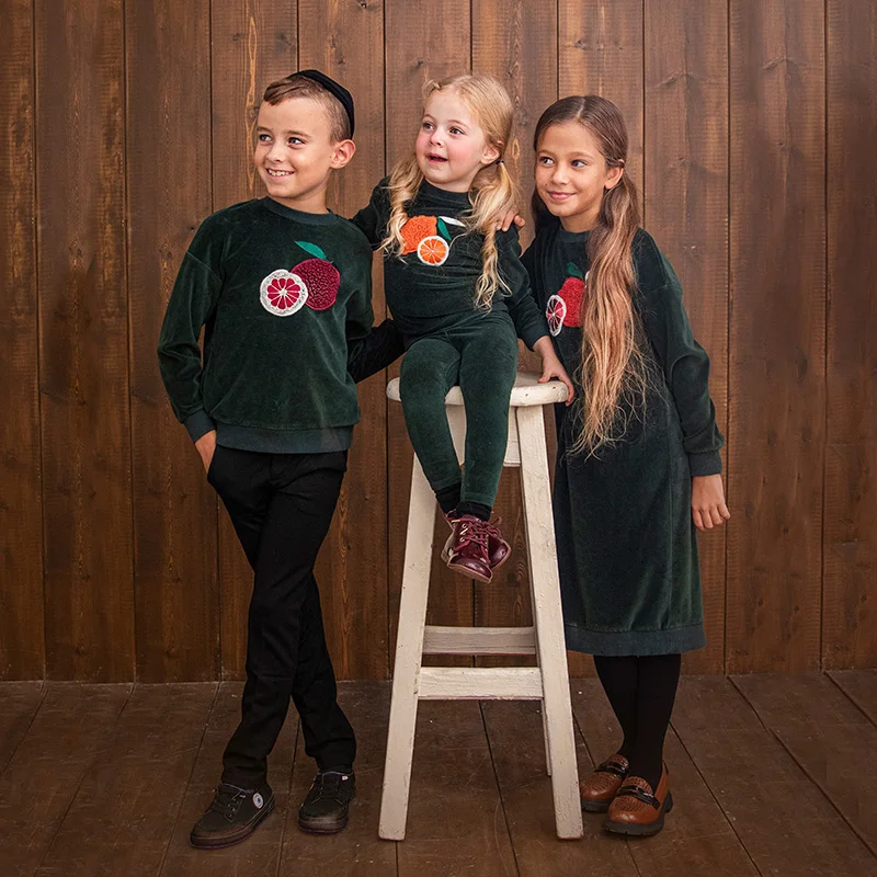 New fall family clothes fruit embroidery kids green velour girls dress boy casual top baby 2pcs set autumn winter long sleeves