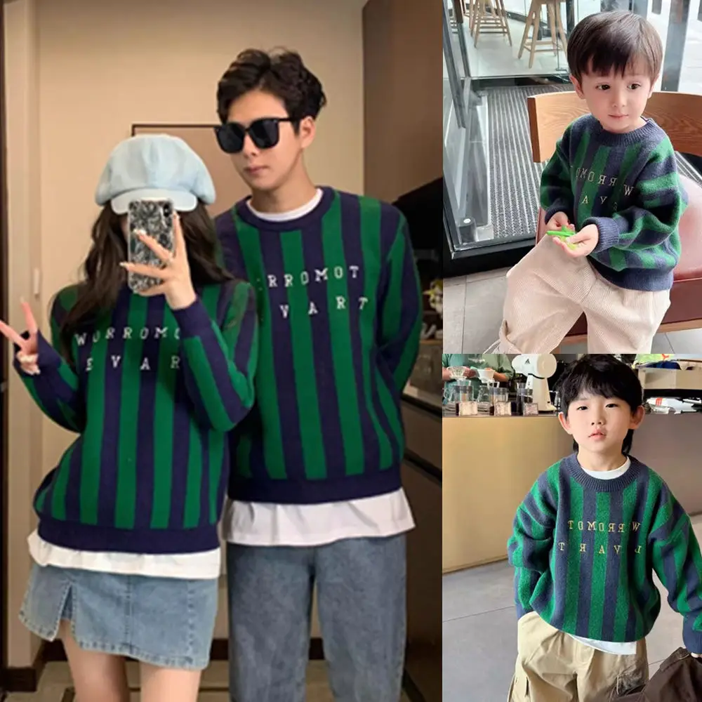 Family Matching Stripe Sweater Vintage Parent-child Green Jumpers Clothes Mother Father and Duahgter Son Knit Pullover Clothing