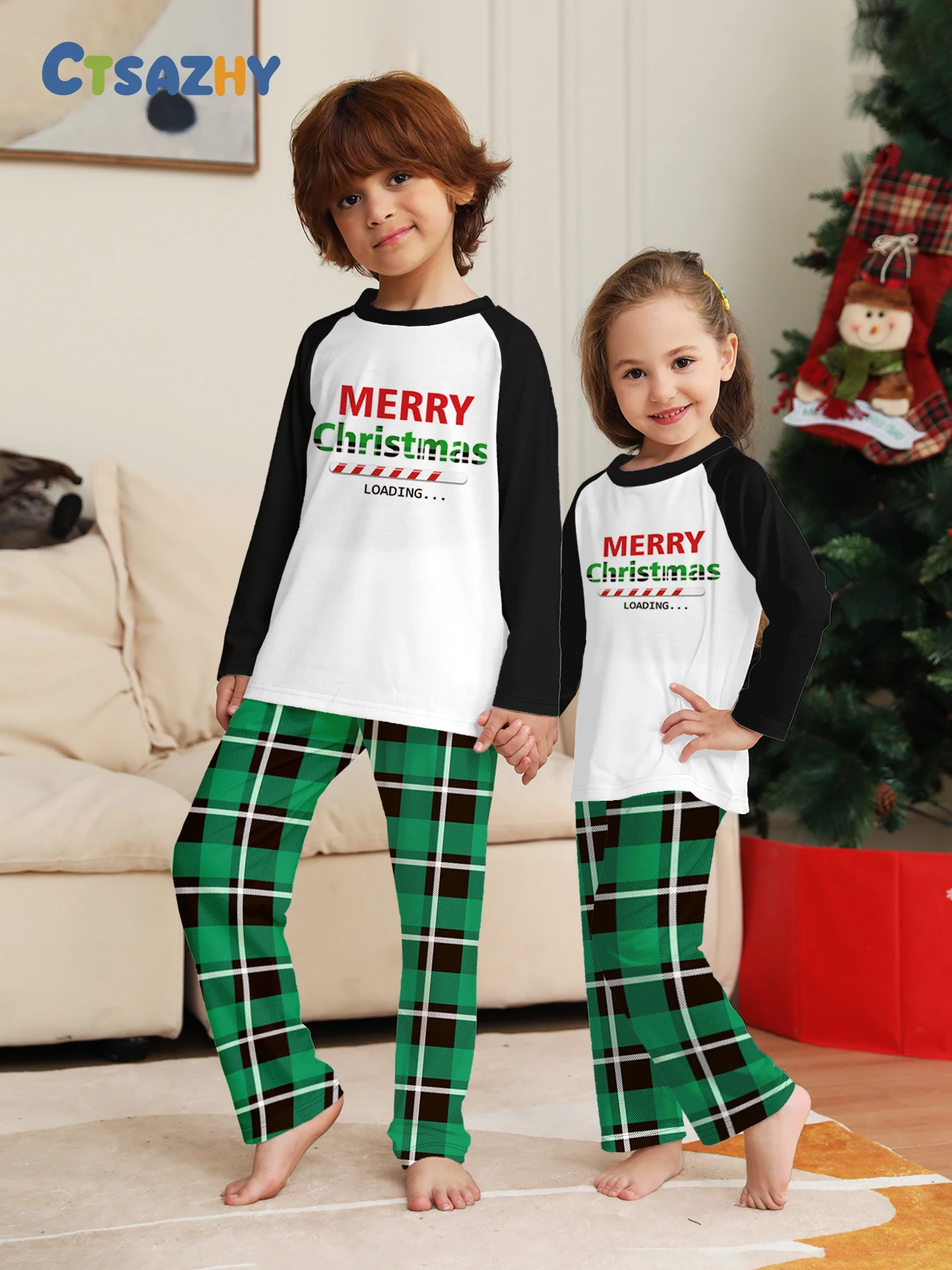 Christmas Kids Pajamas Set "Merry Christmas Loading" Print Raglan Sleeve Green Brown Plaid Sleepwear for Boys Girls