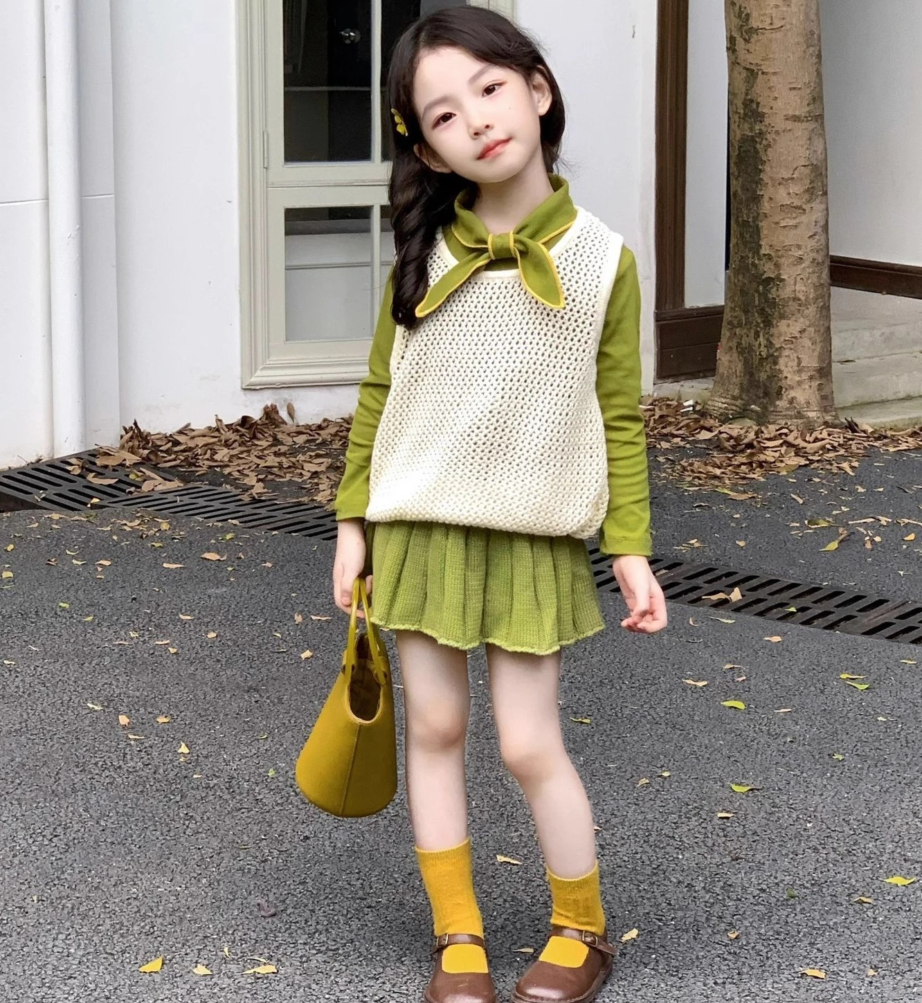 2025 Korean Spring Autumn New Girls Avocado Green Base Shirt Hollowed Out Vest and Yarn Pleated Skirt Three Piece Set Stylish