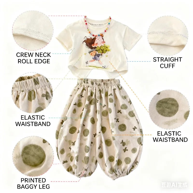 Girls' Cartoon Girl Print Short Sleeve Top and Green Polka Dot Harem Pants Set Cute Summer Casual Toddler Outfit for Daily Wear