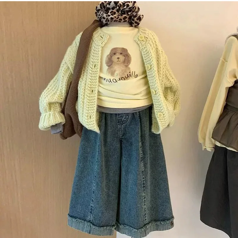 2025 Girls Autumn Green Coarse Needle Woolen Coat Cartoon Inner Base Shirt Wide Leg Jeans Three Piece Set