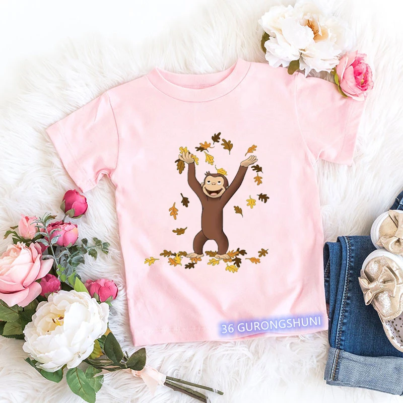 Kawaii girls t-shirts Curious George Cartoon monkey print children's clothing summer tees girls tshirts pink short-sleeved tops