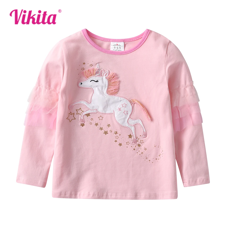 VIKITA Kids Pink Long Sleeve T Shirts Girls Unicorn Appliqued Cartoon T Shirt Kids Cotton Casual Autumn Spring Winter Tops Wear