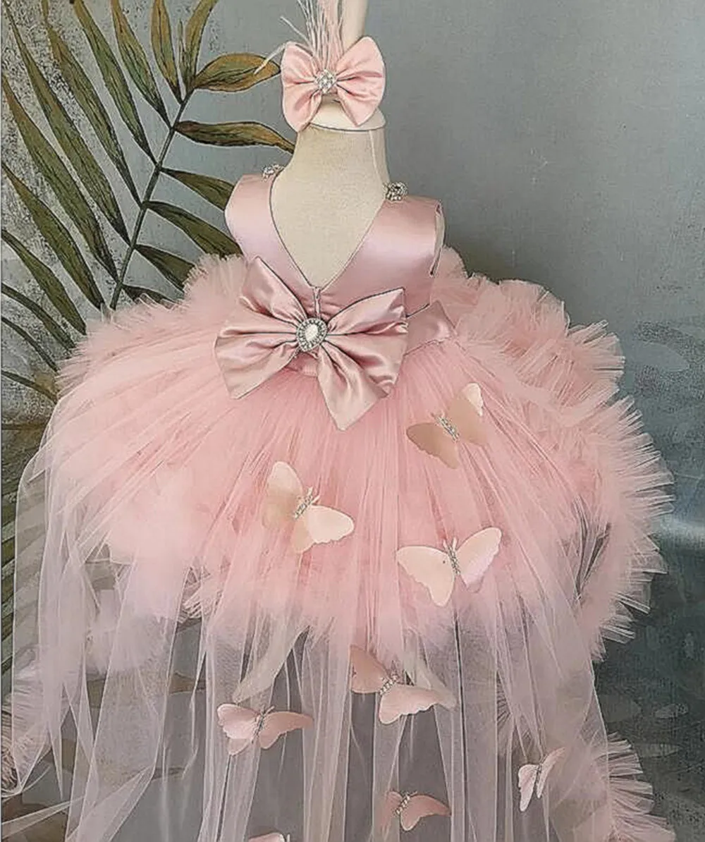 Puffy Girl Dress Pink Baby Dress with Train Flower Girl Dress Bow Cute Kid's Child Birthday Dresses Frist Communion Customized