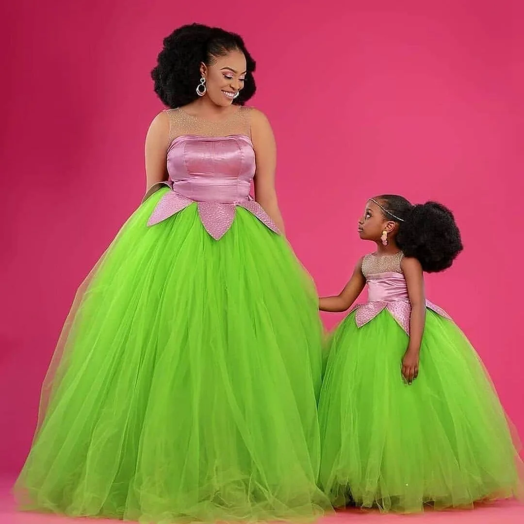 Chic Mom And Kid Family Look Matching Dress For Photo Shoot Pink And Green Extra Puffy Ball Gown Tulle Mother And Me Dressing