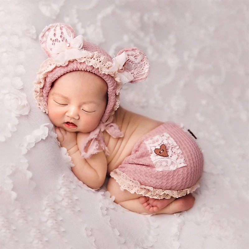 Ylsteed Pink Color Newborn Girl Photography Outfits Bow Bear Ears Hat and Heart Buttons Mini Skirt Set Infant Photography Props