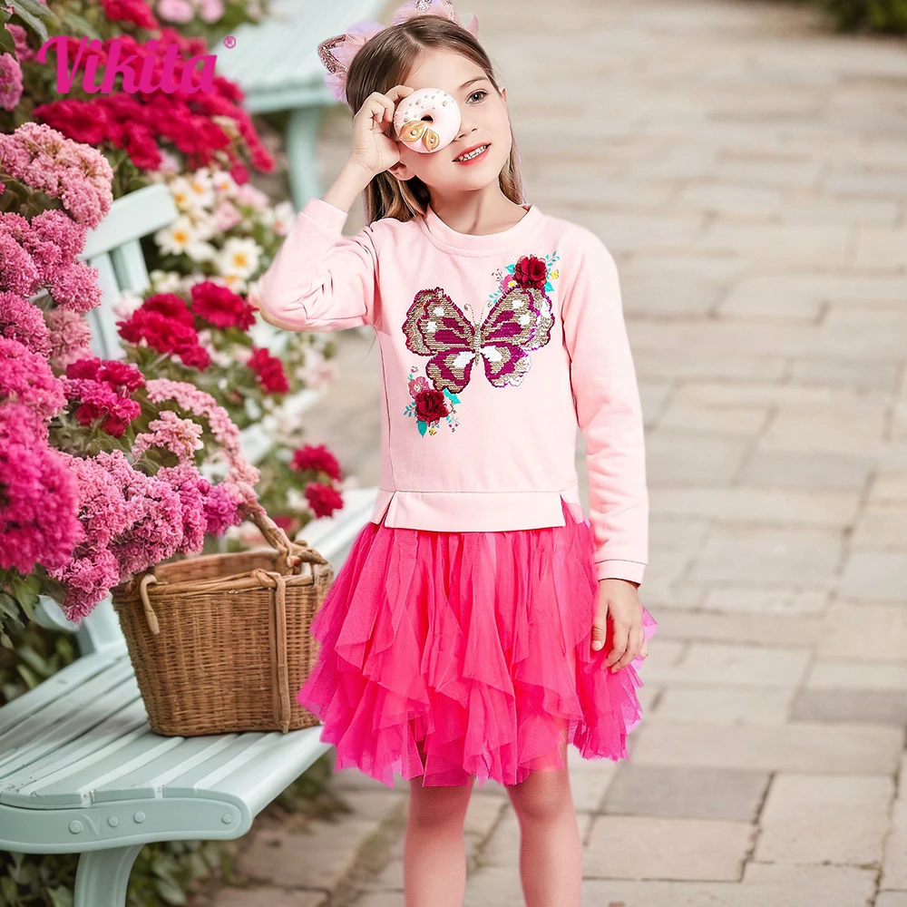 VIKITA Kids Hoodies Dress Girls Patchwork Pink Dresses Girls Sequined Butterfly Appliqued Mesh Tulle Princess Thick Tutu Dress